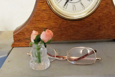I know I've often mentioned my love of all things miniature. One of my perennial favorites (in both senses of the word) is miniature roses. They are tiny versions of the full size variety, winter hardy and almost care free. The last two roses I purchased at the grocery store for $4.00 each and set them on a kitchen counter near the spices while I prepared a pot for them: