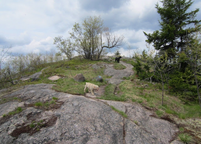 The dogs trotted out to a rocky overlook. That's Tupper Lake in the distance although the town was hidden by another mountain: