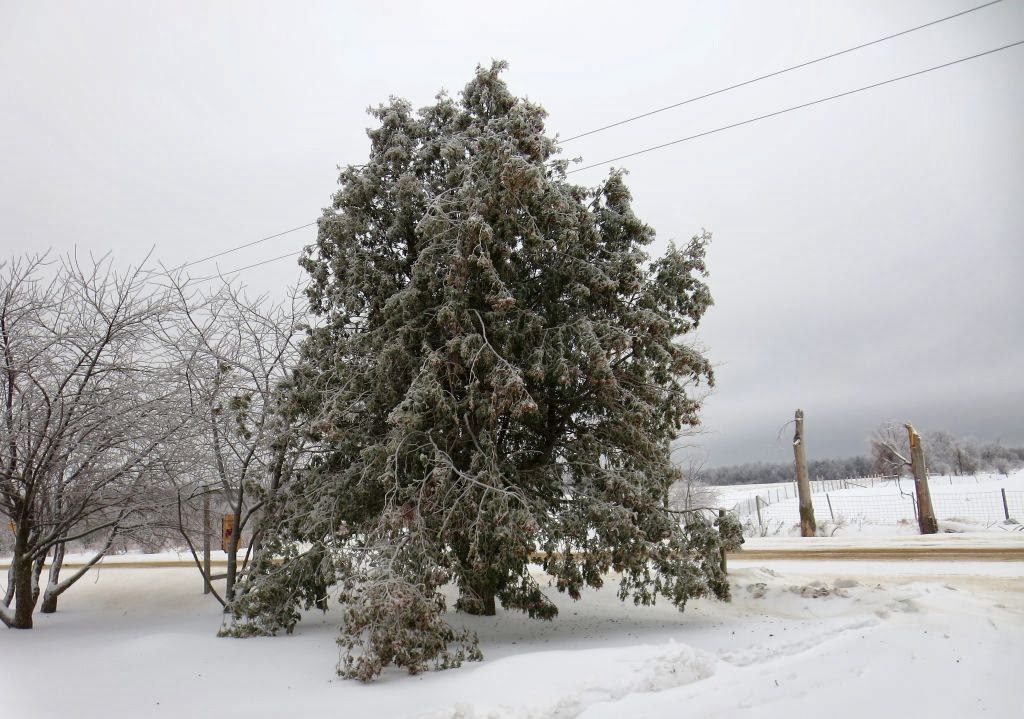 The apple trees were ice covered and, to my surprise, were actually holding up the power line. That's when I was glad I'd never gotten around to pruning them: