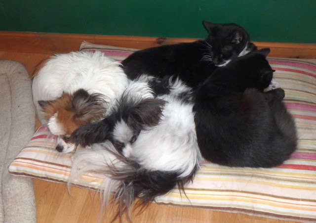 Clover and Daphne curled up on a floor pillow with Rocky and Bugsy: