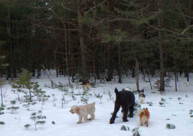 The snow was much deeper under the trees, so I stayed on the dirt lane. That too was difficult walking, with paper thin ice over 8" deep puddles (yes, I got wet - and so did a few of the dogs). Other places were slippery or rutted, but I learned where to walk and where to avoid. The dogs didn't really care. It was all fun for them: