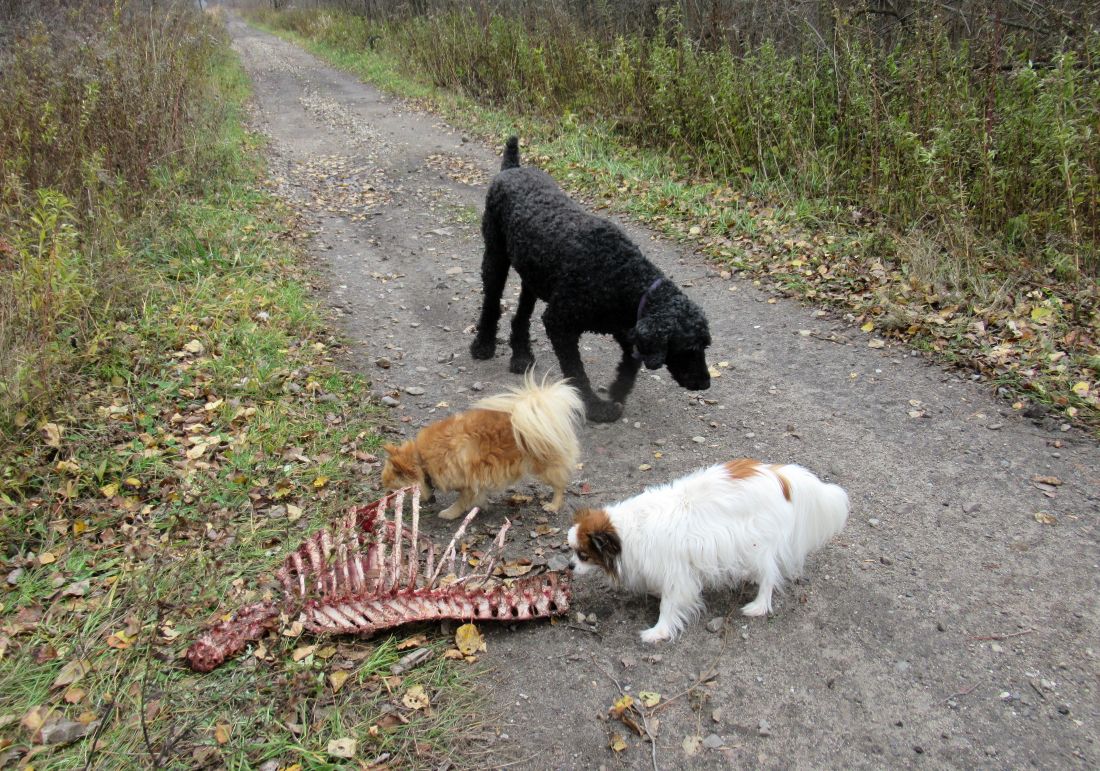 I took the dogs back to the Rutland Nature Trail, only five miles from home, for a quick walk. It's a multiple use trail, so I'd intended to drive in far enough to find a parking place and then set out walking. My aim was to walk farther than ever before, seeing new places. Alas, a fallen tree across the trail caused me to have to back all the way to the road and park where I usually do. We started walking and quickly discovered this deer carcass which someone had dumped (clearly an illegally shot deer). The dogs were interested but showed no inclination to eat it. They all did, however, feel as if they had to pee next to it: